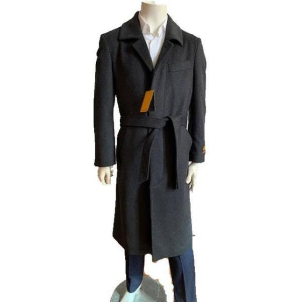 Mens Cashmere Blended Top Coat. Single 4 Button 48 Inch Full Length Coat. Coat is Solid in Color with Hidden Button Design and Belt. 70% Wool, 20% Viscose, 5% Cashmere. Color : Very Dark Grey Almost Black